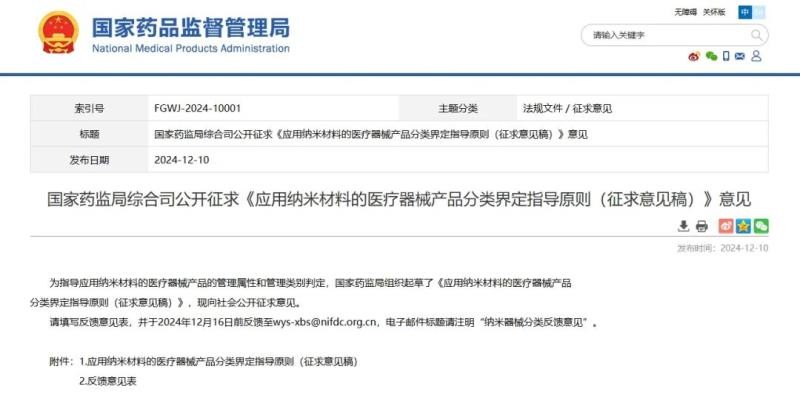 12月10日,国家药监局发布《应用纳米材料的医疗器械产品分类界定指导原则(征求意见稿)》(以下简称《指导原则》),并向社会公开征求意见。
