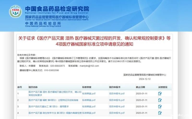 12月12日,国家药监局医疗器械标管中心发布《医疗产品灭菌湿热医疗器械灭菌过程的开发、确认和常规控制要求》《医疗产品灭菌 辐射 第4部分:过程特征及控制指南》《医疗产品的无菌加工第1部分:通用要求》《医疗产品灭菌 微生物学方法 第3部分:细菌内毒素检查》共4项医疗器械国家标准立项申请意见的通知,同时随附了各项标准草案,并向社会公开征求意见。