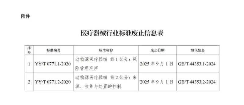1月6日,国家药监局发布公告称,该局决定废止YY/T 0771.1-2020 《动物源医疗器械 第1部分:风险管理应用》和YY/T 0771.2-2020 《动物源医疗器械 第2部分:来源、收集与处置的控制》2项医疗器械行业标准,具体明细如下: