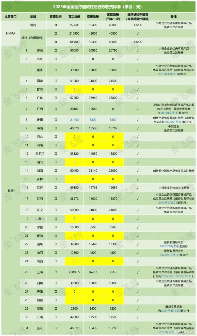 最后依然是按咱们的老规矩,我们将2025年【全国各省医疗器械注册行政收费标准】进行实时更新,具体见下图,大家记得收藏备用哦!