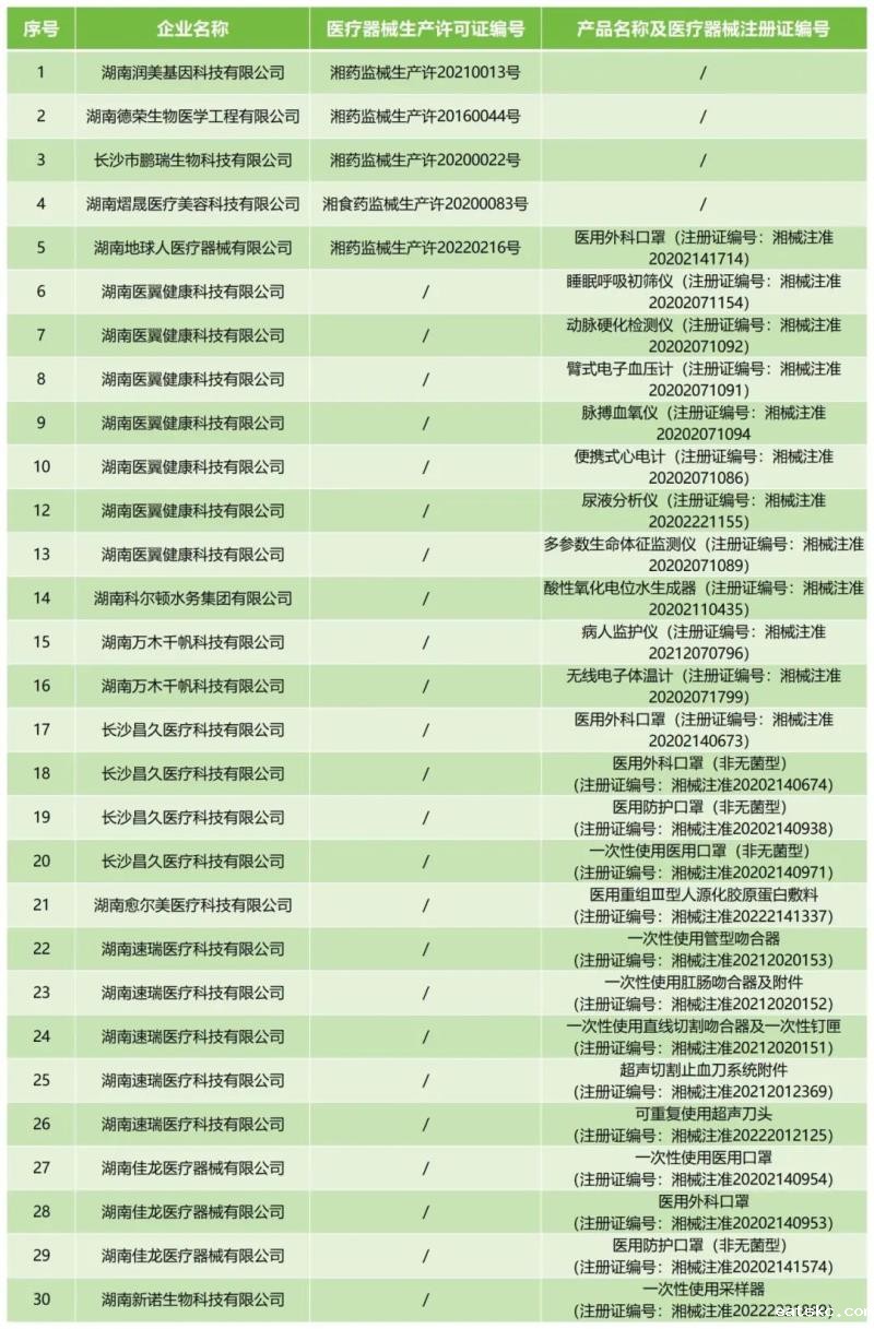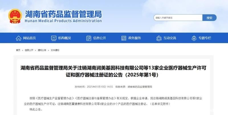 近日,湖南省药监局发布公告称,按照《医疗器械监督管理条例》《医疗器械生产监督管理办法》有关规定,根据企业申请,现注销湖南润美基因科技有限公司等5家企业的医疗器械生产许可证;注销湖南医翼健康科技有限公司、长沙昌久医疗科技有限公司等8家企业的25个产品的医疗器械注册证,具体明细如下: