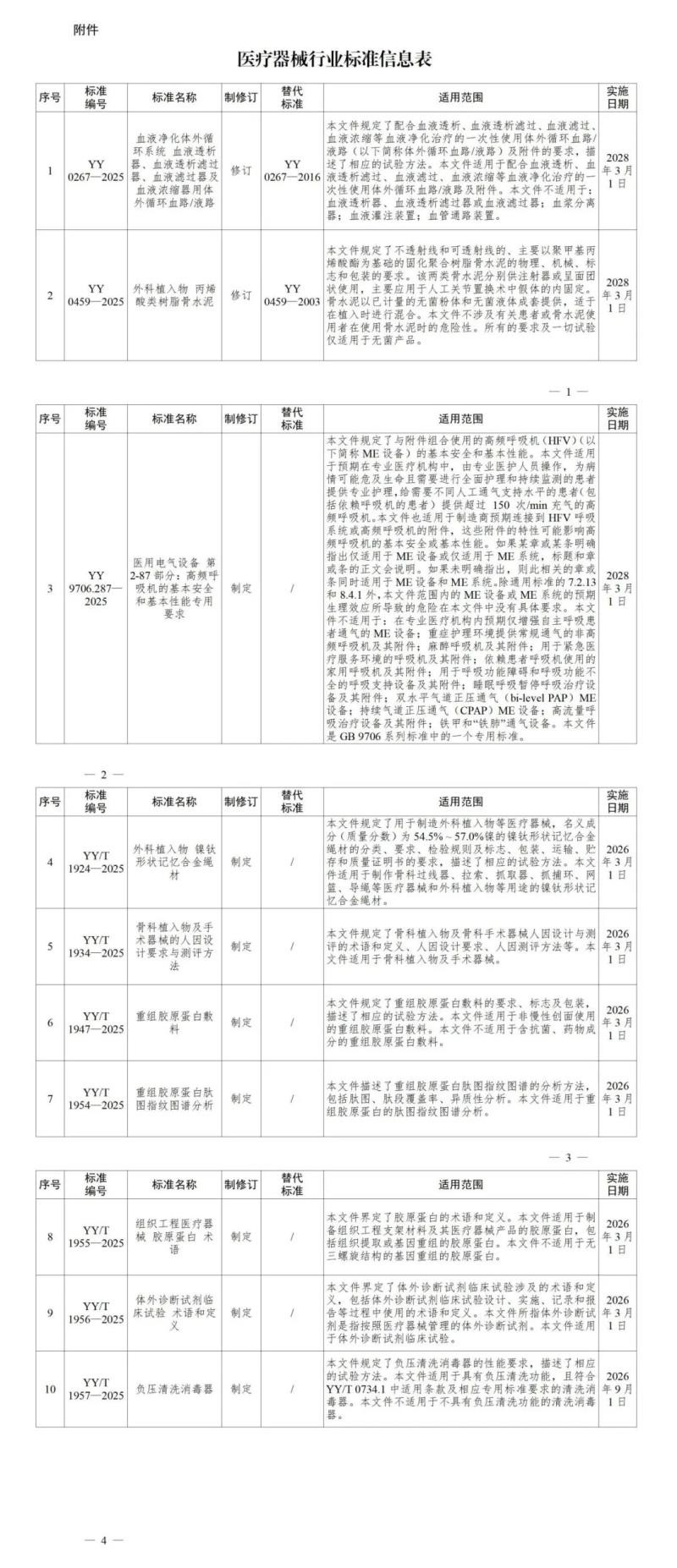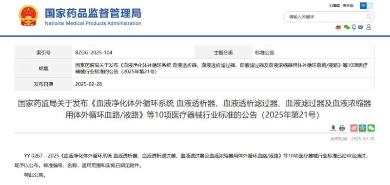 2月28日,国家药监局发布YY 0267-2025《血液净化体外循环系统 血液透析器、血液透析滤过器、血液滤过器及血液浓缩器用体外循环血路/液路》、YY 9706.287-2025《医用电气设备 第2-87部分:高频呼吸机的基本安全和基本性能专用要求》、YY/T 1947-2025《重组胶原蛋白敷料》等10项医疗器械行业标准,其中2项标准为修订,8项为制定,最早自2026年3月1日起实施,具体明细如下: