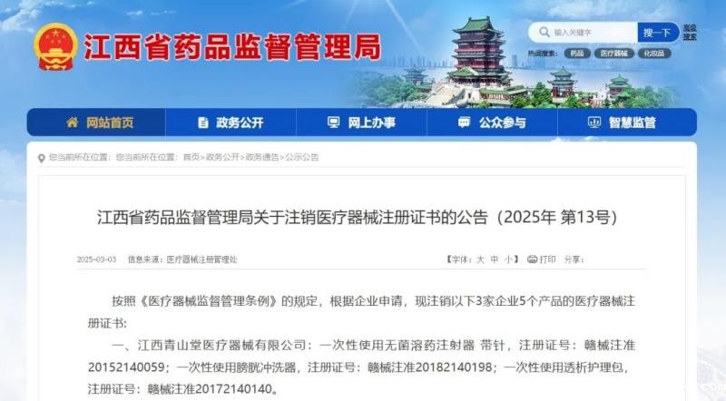 3月3日,江西省药监局发布通告称,按照《医疗器械监督管理条例》的规定,根据企业申请,该局已注销江西青山堂医疗器械有限公司、江西奥格兰医疗器械有限公司等3家企业共计5个产品的医疗器械注册证书,具体明细如下:
