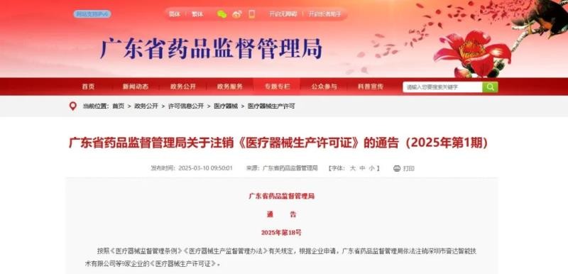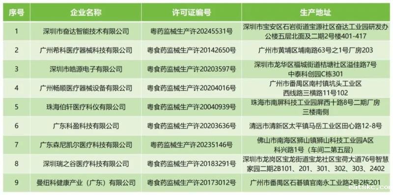 3月10日,广东药监局发布通告称,按照《医疗器械监督管理条例》《医疗器械生产监督管理办法》有关规定,根据企业申请该局已于依法注销注销深圳市奋达智能技术有限公司、广州希科医疗器械科技有限公司等9家企业的《医疗器械生产许可证》,具体明细如下: