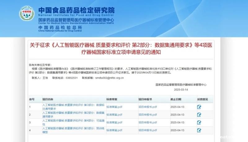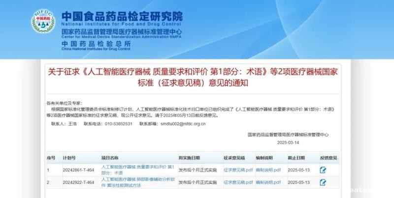 3月14日,国家药监局医疗器械标准管理中心发布《人工智能医疗器械 质量要求和评价 第1部分:术语》《人工智能医疗器械 肺部影像辅助分析软件 算法性能测试方法》2项医疗器械国家标准的征求意见稿,并向社会公开征求意见。