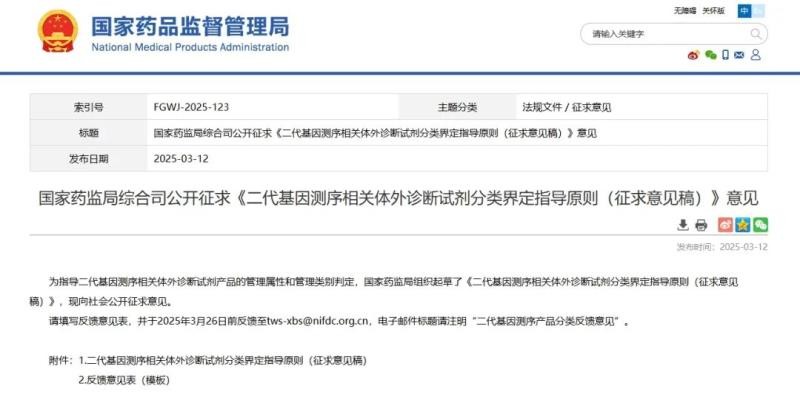 3月12日,国家药监局发布《二代基因测序相关体外诊断试剂分类界定指导原则(征求意见稿)》(以下简称《指导原则》),并向社会公开征求意见。