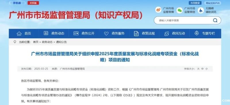 近日,广州市市场监督管理局发布《关于组织申报2025年度质量发展与标准化战略专项资金(标准化战略)项目的通知》(以下简称《通知》),共提到了7种项目申报范围,包括标准制定修订项目、标准化组织项目、标准化研究项目等,具体事项如下: