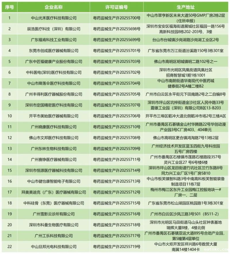 近日,广东省药监局公布了《2025年3月医疗器械生产许可证核发清单》,据该公开数据显示,该月中山光禾医疗科技有限公司、辰浩医疗科技(深圳)有限公司、东莞市创成医疗器械有限公司等共计22家企业新拿到了医疗器械生产许可证,具体明细如下: