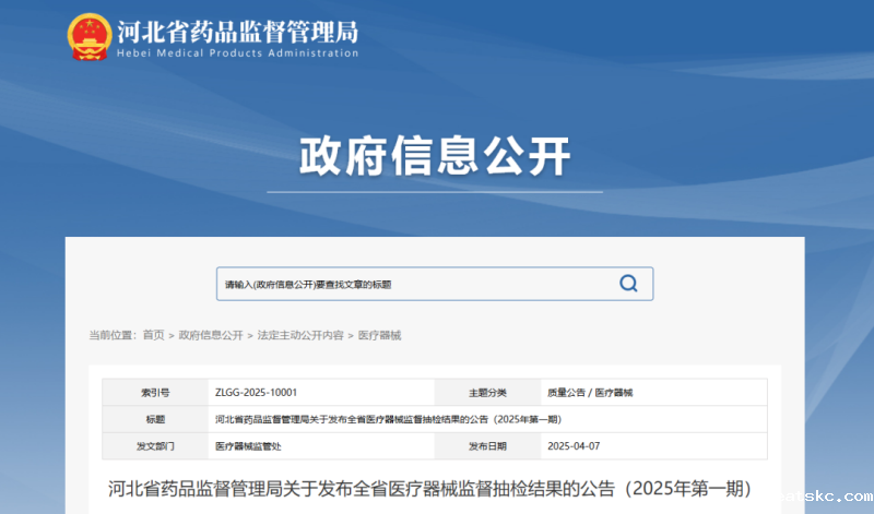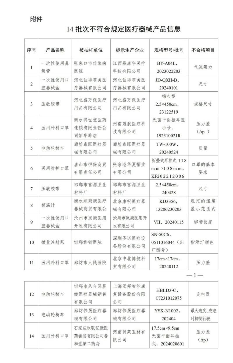 近日,河北省药监局发布《全省医疗器械监督抽检结果的公告(2025年第一期)》,其中提到,该局组织对2024年全省生产、经营和使用等环节医疗器械进行了质量监督抽检,共发现14批次产品不符合标准规定,包括一次性使用鼻氧管、医用外科口罩、电动轮椅车、微量注射泵等,具体明细如下: