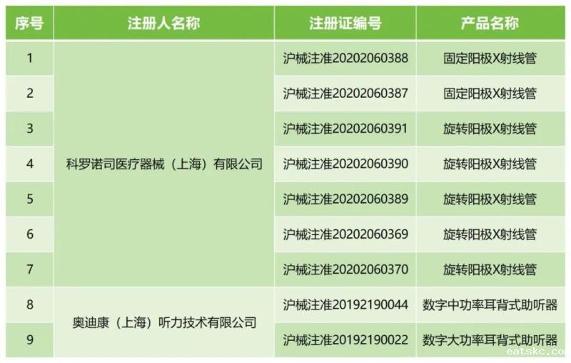 4月21日,上海市药监局发布通告称,按照《医疗器械监督管理条例》的规定,根据企业申请,该局已注销科罗诺司医疗器械(上海)有限公司等2家企业共9个产品的医疗器械注册证,包括固定阳极X射线管、数字中功率耳背式助听器等,具体明细如下: