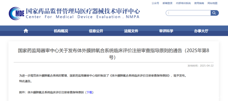 4月22日,国家药监局器审中心发布《体外膜肺氧合系统临床评价注册审查指导原则》(以下简称《指导原则》),其中提到,体外膜肺氧合医疗器械产品分为体外膜肺氧合设备和体外膜肺氧合器具,可通过同品种临床评价路径开展临床评价,即基于与已上市产品的全面对比,以及科学设计的、高质量的、可靠的台架试验、动物试验,和/或一定样本量的临床试验开展临床评价。