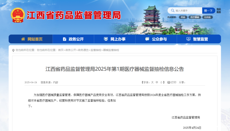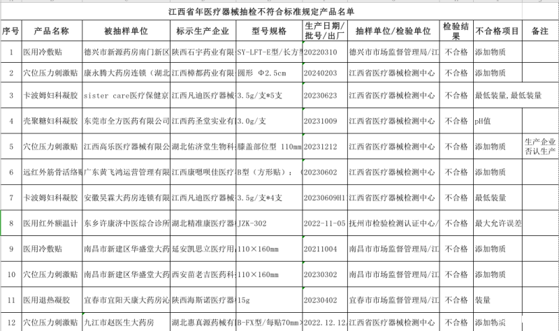 近日,江西省药监局发布公告称,该局持续对本省医疗器械生产、经营和使用环节实施了监督抽样检验,共有12批次产品不符合标准规定,涉及医用冷敷贴、穴位压力剌激贴、卡波姆妇科凝胶、壳聚糖妇科凝胶等产品,多款产品不合格项目为“添加物质”,具体明细如下: