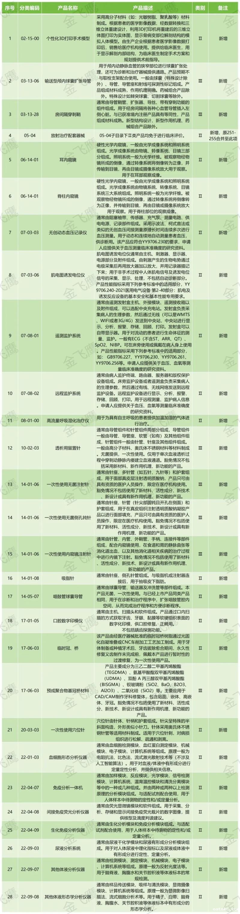 5月13日,国家药监局官网发布《免于进行临床评价医疗器械目录(2025年)》(以下简称《目录》),本次《目录》中共包含1047类(2023年为1025类)产品,通过查看附件我们可以发现,本次新增的免临床产品包括个性化3D打印手术模型、无创动态血压记录仪、远程监护系统、一次性使用无菌注射针(用于面部真皮层注射透明质酸钠)等。由于《目录》全文字数较多,不便在文章中全部展示,我们仅将本次新增的免临床评价产品汇总如下,以供相关企业参考: