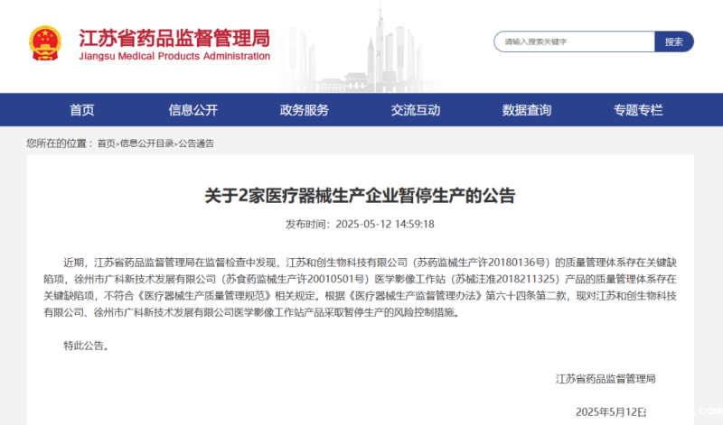 近日,江苏省药监局发布公告称,该局在监督检查中发现,江苏**生物科技有限公司(苏药监械生产许201801**号)的质量管理体系存在关键缺陷项,徐州市**新技术发展有限公司(苏食药监械生产许200105**号)医学影像工作站(苏械注准20182113**)产品的质量管理体系存在关键缺陷项,不符合《医疗器械生产质量管理规范》相关规定。根据《医疗器械生产监督管理办法》第六十四条第二款,现对江苏**生物科技有限公司、徐州市**新技术发展有限公司医学影像工作站产品采取暂停生产的风险控制措施。