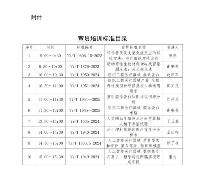 对YY/T 0606.15-2023《评价基质及支架免疫反应的试验方法:淋巴细胞增殖试验》、YY/T 1955-2025《组织工程医疗器械 胶原蛋白术语》、YY/T 1833.5-2024《人工智能医疗器械 质量要求和评价 第5部分:预训练模型》等10项行业标准进行宣贯培训,具体清单及安排如下: