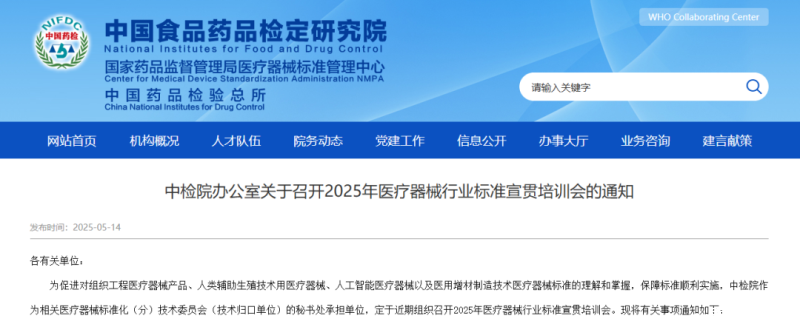 5月14日,中检院发布一则2025年医疗器械行业标准宣贯培训会的通知,其中提到,该院近期将对组织工程医疗器械产品、人类辅助生殖技术用医疗器械、人工智能医疗器械以及医用增材制造技术医疗器械标准进行宣贯培训。有关事项具体如下: