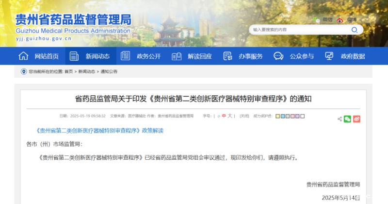 5月19日,贵州省药监局发布《贵州省第二类创新医疗器械特别审查程序》(以下简称《程序》),其中提到,符合以下条件的,申请人可以向省局申请第二类创新医疗器械特别审查:
