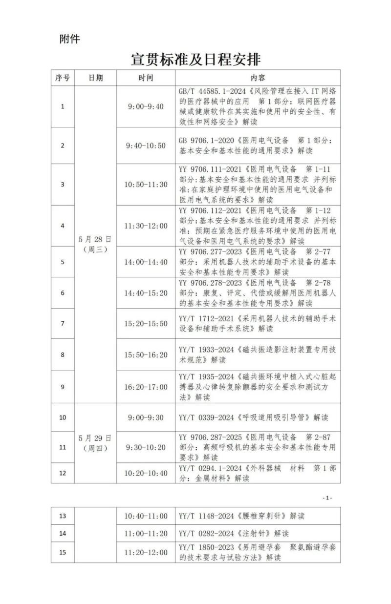 对GB/T 44585.1-2024《风险管理在接入IT网络的医疗器械中的应用 第1部分:联网医疗器械或健康软件在其实施和使用中的安全性、有效性和网络安全》、GB 9706.1-2020《医用电气设备 第1部分:基本安全和基本性能的通用要求》、YY 9706.111-2021《医用电气设备 第1-11部分:基本安全和基本性能的通用要求 并列标准:在家庭护理环境中使用的医用电气设备和医用电气系统的要求》等15项行业标准进行宣贯培训,具体清单及安排如下: