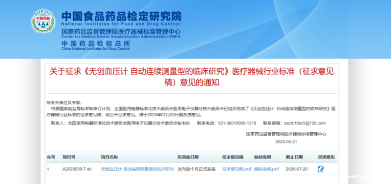 近日,国家药监局医疗器械标准管理中心发布《无创血压计 自动连续测量型的临床研究》医疗器械行业标准(征求意见稿),并向社会公开征求意见。