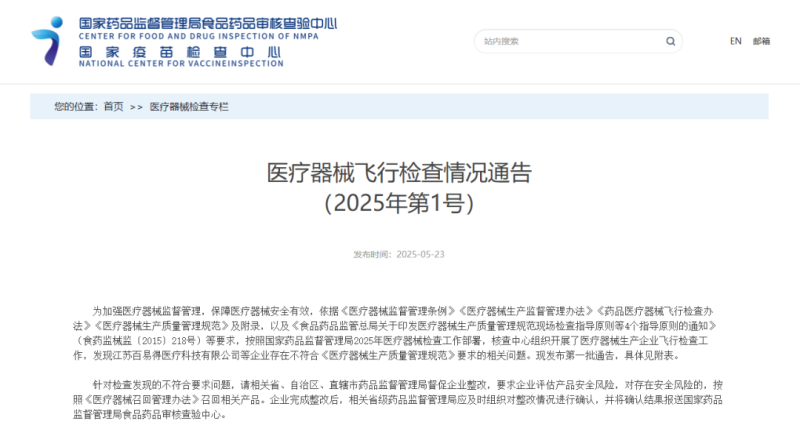 近日,国家药监局食品药品审核查验中心(以下简称“核查中心”)发布《医疗器械飞行检查情况通告(2025年第1号)》,其中提到,核查中心组织开展了医疗器械生产企业飞行检查工作,发现江苏百易得医疗科技有限公司、朔崛(江苏)医疗科技有限公司、江西洪达医疗器械集团有限公司等18家企业存在不符合《医疗器械生产质量管理规范》要求的相关问题,生产品种包括不可吸收带线锚钉、血液透析浓缩液、髋关节假体、医用胶原填充剂、注射用交联透明质酸钠凝胶等。