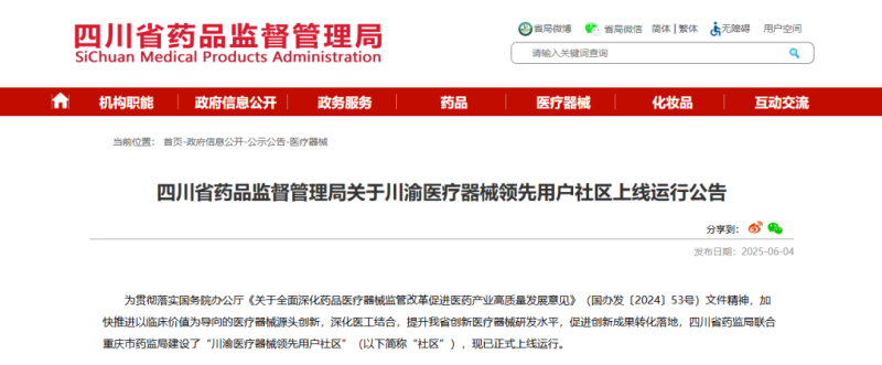 近日,四川省药监局发布公告称,该局联合重庆市药监局建设的“川渝医疗器械领先用户社区”(点击文末“阅读原文”可直达)已正式上线运行。
