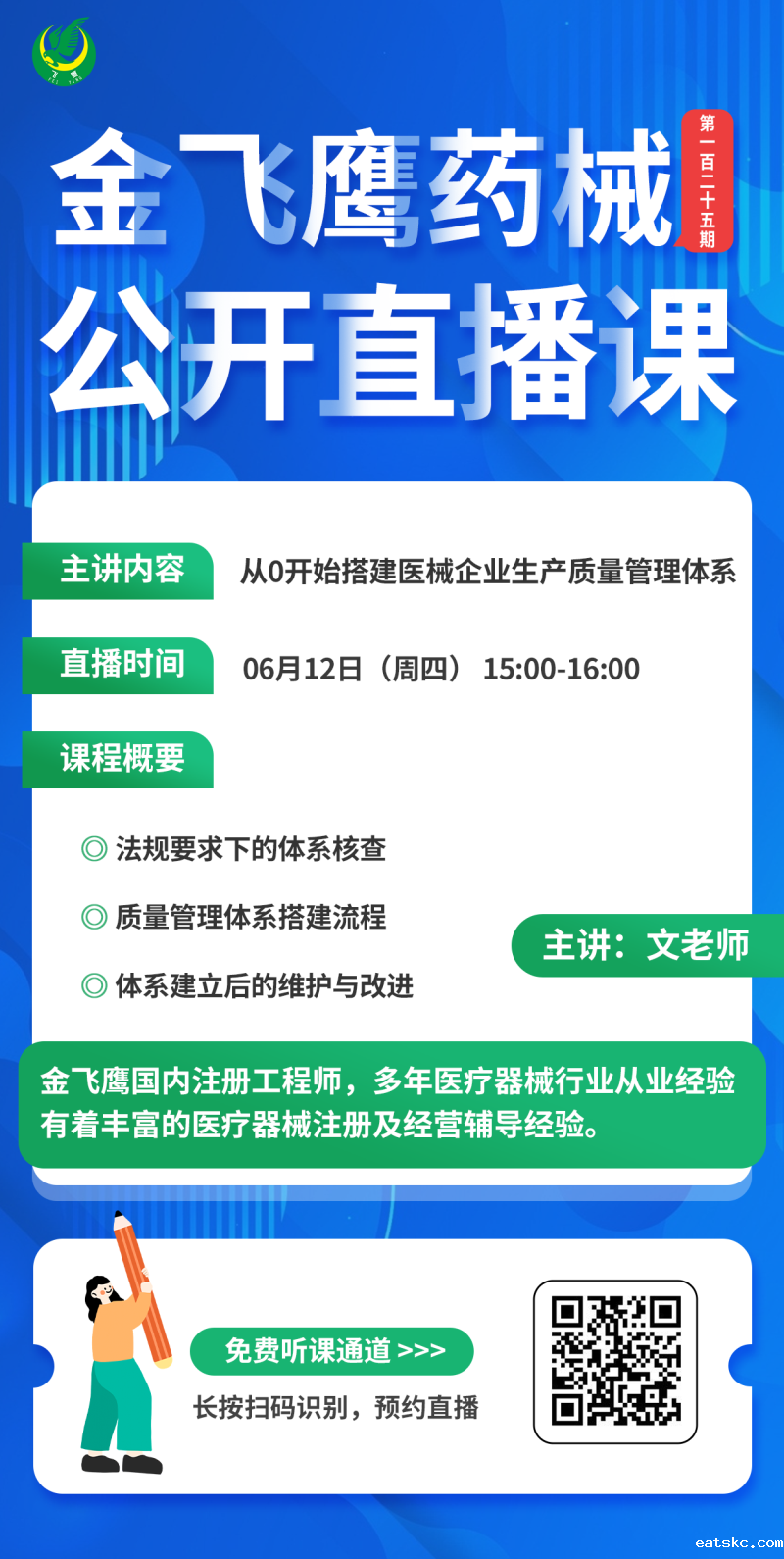 6月12日下午3点,betway必威西盟体育官网入口国内注册工程师、有着丰富医疗器械注册及经验辅导经验的文老师给大家带来《从0开始搭建医械企业生产质量管理体系》,感兴趣的朋友记得提前预约,我们直播间不见不散~