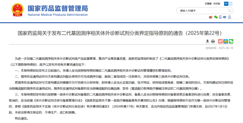 6月10日,国家药监局发布《二代基因测序相关体外诊断试剂分类界定指导原则》(以下简称《指导原则》),并就《指导原则》实施的有关事项通告如下: