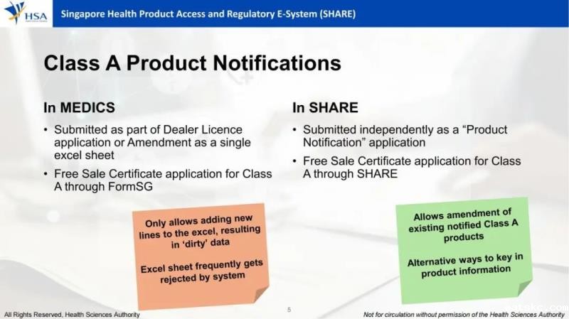 ↑ 在MEDICS系统中,A类产品通知作为经销商许可证申请或变更的组成部分,通过单一Excel表格提交,产品自由销售证书需通过FormSG申请;而在SHARE中,A类产品通知作为独立的“产品通知”申请提交,产品自由销售证书可直接通过SHARE申请。
