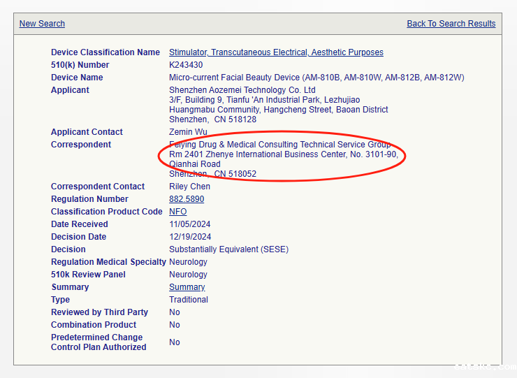 2024年底,我们成功辅导深圳一家企业获批微电流美容仪的510(k),值得一提的是,由于该产品融合了微电流与光疗双重技术(基于不同的预期用途、技术特性及FDA审评要求),它同时拥有2个K号,其中微电流的K号明细如下: