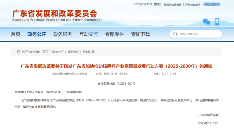 近日,广东省发展和改革委员会发布《广东省加快推动核医疗产业高质量发展行动方案(2025-2030年)》(以下简称《方案》),从提升核医疗科技创新水平、健全医用同位素供应体系等8方面共提出了20条措施,《方案》全文如下: