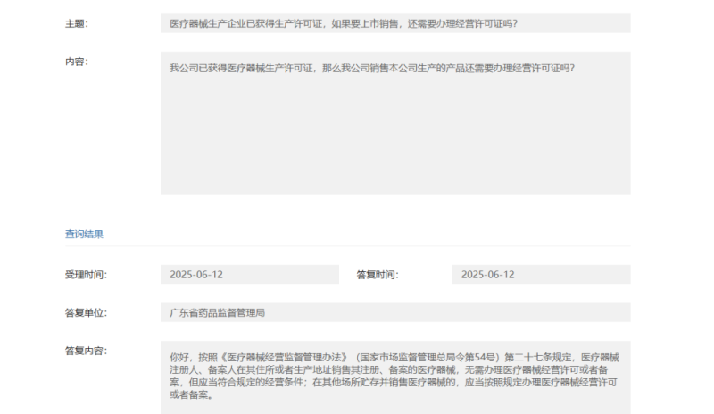根据广东省药监局的答复,按照《医疗器械经营监督管理办法》(国家市场监督管理总局令第54号)第二十七条规定,医疗器械注册人、备案人在其住所或者生产地址销售其注册、备案的医疗器械,无需办理医疗器械经营许可或者备案,但应当符合规定的经营条件;在其他场所贮存并销售医疗器械的,应当按照规定办理医疗器械经营许可或者备案。