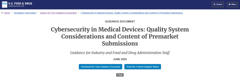 6月27日,FDA发布有关医疗器械网络安全的指南文件Cybersecurity in Medical Devices:Quality System Considerations and Content of Premarket Submissions,用以取代 2023 年 9 月 27 日发布的最终指南“医疗器械中的网络安全:质量体系注意事项和上市前提交的内容”。该指南首次将网络安全要求从“推荐性指南”升级为“法定强制”,全面强化医疗器械全生命周期的网络安全监管。