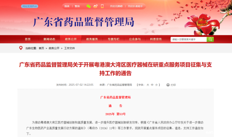 7月2日,广东省药监局发布《关于开展粤港澳大湾区医疗器械在研重点服务项目征集与支持工作的通告》(以下简称《通告》),以推动粤港澳大湾区医疗器械创新和高质量发展,进一步提升医疗器械创新研发效率。《通告》正文内容如下: