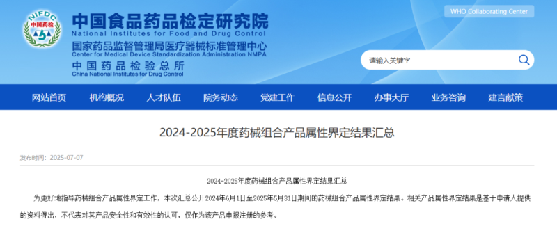 7月7日,中检院汇总公开了2024年6月1日至2025年5月31日期间的药械组合产品属性界定结果,共包含78款产品,其中建议按照以药品为主的药械组合产品申请注册有7款,建议按照以医疗器械为主的药械组合产品申请注册有47款,建议应按药品申请注册的有22款,建议应按医疗器械申请注册有2款,具体明细如下: