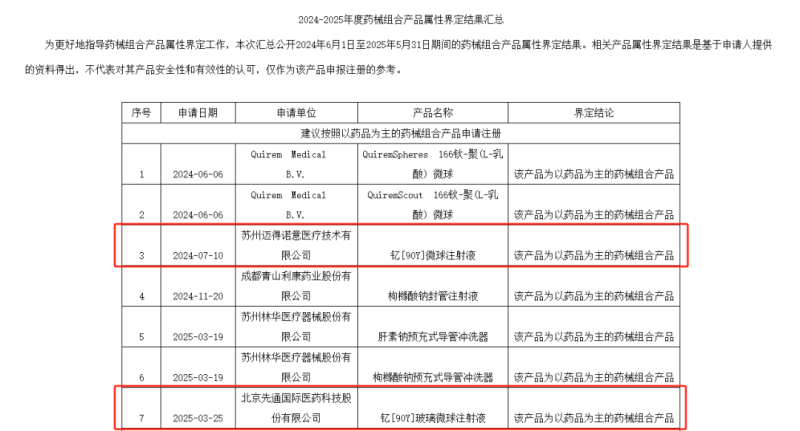 近日,中检院发布了《2024-2025年度药械组合产品属性界定结果汇总》,其中有两款被界定为“以药品为主的药械组合产品”引起了我们的注意——钇[90Y]微球注射液。