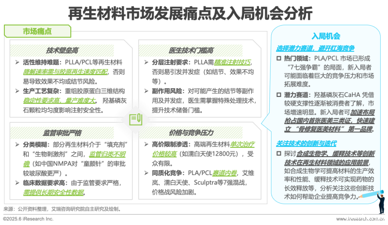 再生材料市场正面临着技术壁垒高、医生技术门槛高、监管审批严格以及价格与竞争压力大的多重挑战。然而,市场痛点背后也蕴藏着入局机会。新入局者可选择潜力赛道,避开红海竞争,如羟基磷灰石CaHA凭借其较硬支撑性逐渐被消费者了解,市场增长迅速,新入局者可加速布局,抢占国内尚未有三类证的先机,快速建立品牌优势。同时,要关注技术的创新与迭代,比如合成生物学可提高材料的生产效率和性能,缓释技术可实现药物的长效释放等,深入分析这些创新技术在再生材料领域的应用前景,助力企业提高竞争力,从而在再生材料市场中寻得发展新路径。