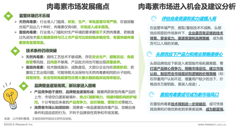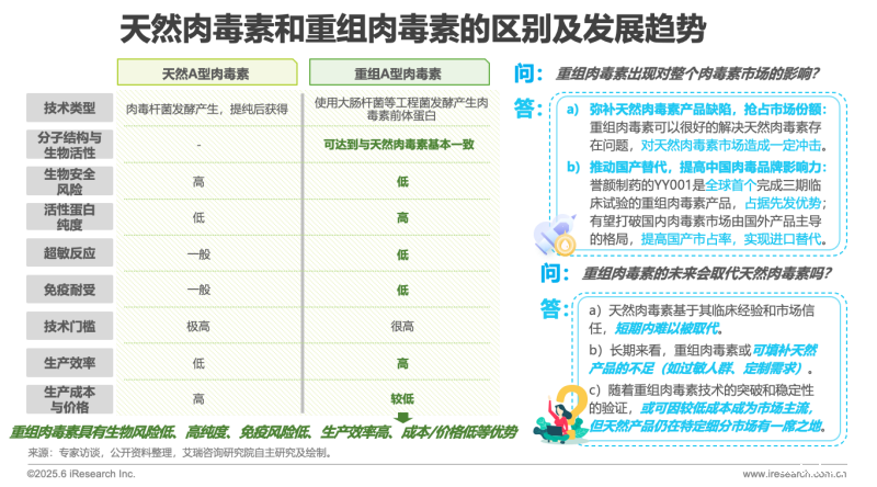天然肉毒素是从肉毒杆菌培养液中提取的神经毒素,含有毒素蛋白及辅助蛋白,临床应用历史悠久,但可能存在批次差异和杂质风险。重组肉毒素通过基因工程生产,仅含纯化毒素蛋白,纯度高、稳定性强,并可定制化调整效力或持久性。未来,重组肉毒素有望凭借安全性和可设计性逐步渗透医美市场,但短期内天然产品仍占主导。长期来看,两者可能共存——重组产品侧重高纯度、个性化需求,而天然产品依赖品牌信任和成熟应用。技术进步和成本优化将是重组肉毒素能否颠覆市场的关键。