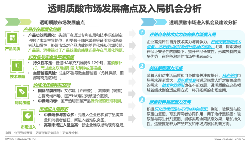中国透明质酸行业近年来经历了显著的增长,这一趋势得益于市场需求的不断扩大以及应用领域的持续拓展。然而,在这一高速增长的背后,行业也面临着产品同质化、长效性与安全性平衡难题、价格战和市场进入障碍等痛点。尽管如此,行业的发展并非没有机遇。技术创新是实现产品差异化的关键,企业可以通过研发新技术、改进生产工艺等方式,提升产品的竞争力。企业若能评估自身技术实力实现差异化创新,关注私密美容等新型潜力市场,探索与胶原蛋白等材料复配的潜力方向,也能在竞争中寻得入局发展的机会。