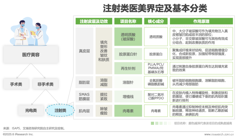 引言 近年来,中国医美市场呈现爆发式增长态势,其中以声光电类和注射类项目最受消费者青睐,已成为医美消费的“双引擎”。从市场表现来看,声光电类项目市场份额略高于注射类项目,这类项目主要以紧致抗衰为主,多为无创/微创项目,以更“轻”的手段达到抗衰的目的吸引了更多消费者。但事实上,注射类项目同样占据着举足轻重的市场地位,为帮助行业从业者更深入了解注射类医美市场,本期文章我们部分转载了艾瑞咨询的《中国注射类医美行业研究报告》,以供相关企业参考。