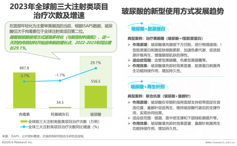 随着医美上游材料的多样化,玻尿酸作为“顶流”的地位是否会受到冲击一直是行业内热议的话题。根据ISAPS数据,2023年全球注射类项目排名中,玻尿酸仅次于肉毒素位居第二。但随着玻尿酸的复配方式多样化、联合治疗手段越来越成熟,其应用边界被不断拓宽,2022-2023年增速远超肉毒素达29.1%,似乎迎来了它的“第二增长曲线”。