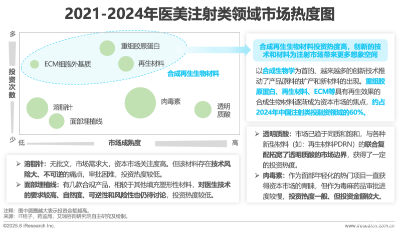 技术的进步推动着上游原料的扩产和材料的多样化、安全化和同源化,ECM等各种新型材料不断出现,以重组胶原蛋白、再生材料等为首的合成再生生物材料成为医美机构投资重点。根据IT桔子数据,2024年包括泰美瑞、圣至润和等在内的再生生物材料领域的企业纷纷融资,投资事件约占总注射类材料投资的60%。按照审批情况来看,根据药监局不完全统计,截止到2024年11月一共有15款针剂通过审批,以玻尿酸类为主,还有几款聚左旋乳酸、聚己内酯和肉毒素类产品。虽然玻尿酸领域近年来投资热度一般,但其仍为注射类市场的“老字号产品”和“热门赛道”,与各种新型材料的联合复配也将进一步丰富产品矩阵,拓宽注射类市场边界。