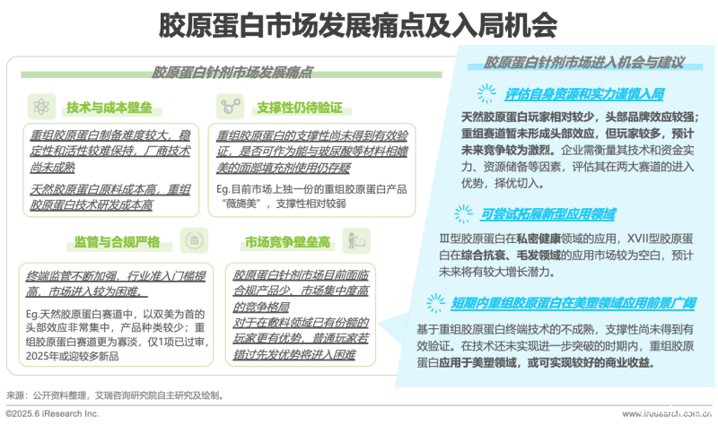 胶原蛋白作为人体内天然存在的成分,与玻尿酸一样,对医疗美容存在着重大的意义。目前,胶原蛋白二类械市场竞争已十分火热,但鉴于终端技术的限制,医美针剂等三类械市场仍相对空白。随着2025年三类械批证的增加,胶原蛋白针剂市场竞争将逐渐激烈,市场格局有望产生新的变化。由于终端技术还不够成熟,成本困境仍未突破,相较于玻尿酸等市场,胶原蛋白针剂在医美领域的渗透率相对较低;但鉴于其天然性、与人体的适配性,在技术突破之前,或将在美塑领域侵占较大市场份额。