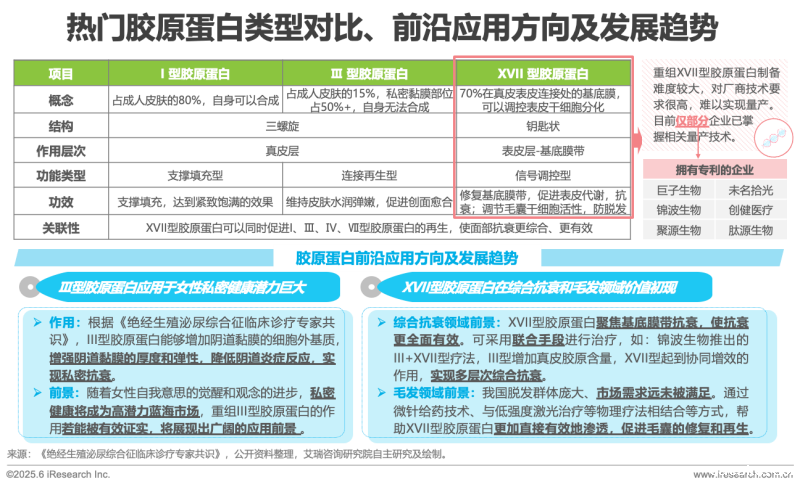 胶原蛋白按照结构和功能可以划分为28种类型(包括I、Ⅱ、Ⅲ、Ⅳ、Ⅴ、Ⅵ、Ⅹ、XVII…),每种类型的胶原蛋白在人体中扮演着不同的角色。近年来,医美行业应用最为广泛的是I型和Ⅲ型胶原蛋白,起到面部支撑填充及皮肤水润弹嫩的效果,是抗衰界的潮流产品。随着对这两种胶原蛋白适应症的不断开拓、专业玩家技术的成熟及下游消费者需求的进阶,以XVII型为代表的更多类型的胶原蛋白及其多元功效被不断发掘,终端应用场景不断拓展,产品矩阵日渐丰富。