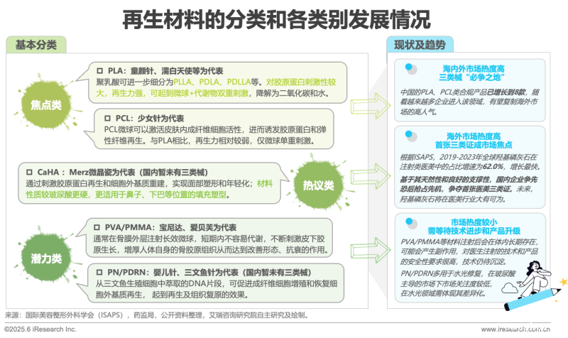 医美再生注射类产品通常以微球的形式存在,通过刺激人体自身胶原蛋白的再生,起到填充凹陷、紧致肌肤、美容塑型的作用。医美再生材料种类较多,近两年市场焦点基本集中在聚乳酸(PLA)和聚己内酯(PCL)两大类别,以童颜针、少女针为代表的一系列再生针剂赋予医美市场更丰富的品类和更高的增速,也成为各大厂商进军再生领域的“必争之地”。其次,羟基磷灰石(CaHA)作为人体中天然存在的一种材料广泛用于骨修复,它较硬的支撑性或可推动其未来在隆鼻、垫下巴等填充领域获得较大市场份额。