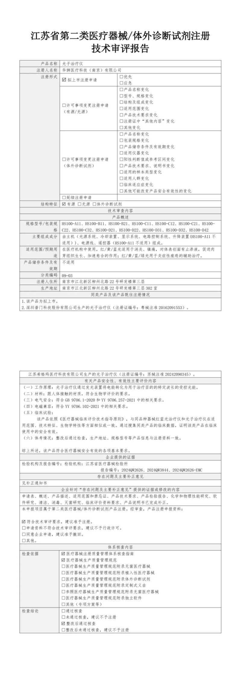 7月12日,江苏省药监局公布了2025年6月批准注册的重组胶原蛋白喷剂敷料、明火艾灸仪、立体动态干扰电治疗仪、定制式增材制造截骨导板、穿戴式动态心电记录仪、运动气压治疗系统、眼底照相机、掌上超声波电刺激治疗仪、光子治疗仪、磁振热治疗仪等151个医疗器械产品目录,同时随附了所有产品的技术审评报告,我们其中“光子治疗仪”(预期用途:在医疗机构中使用,红/黄/蓝光适用于消炎、镇痛,对体表创面有止渗液,促进肉芽组织生长、加速愈合的作用;红/黄/蓝/绿光用于炎症性痤疮的辅助治疗)的技术审评报告以图片形式转载如下: