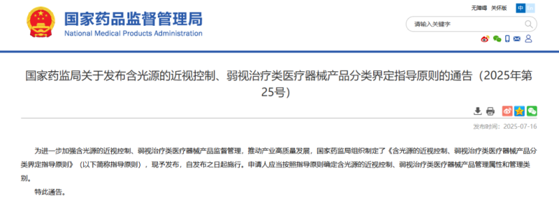 7月16日,国家药监局发布《含光源的近视控制、弱视治疗类医疗器械产品分类界定指导原则》(以下简称《指导原则》),并宣布自发布之日起施行。