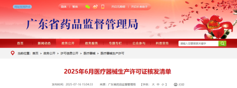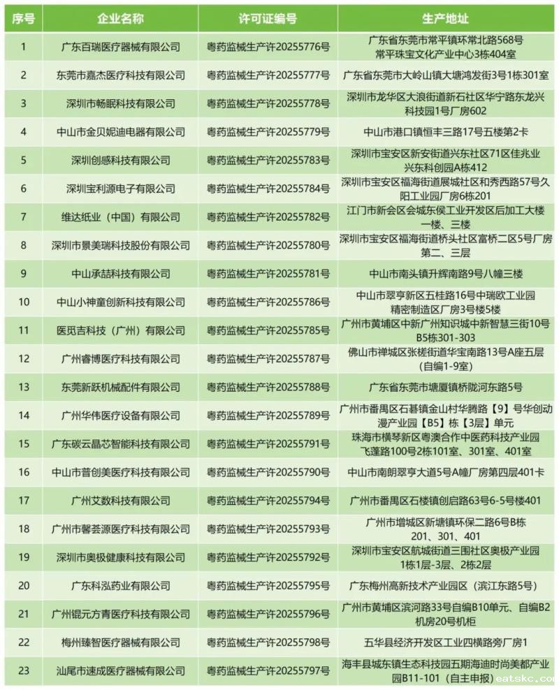 近日,广东省药监局公布了《2025年6月医疗器械生产许可证核发清单》,据该公开数据显示,2025年6月,广东百瑞医疗器械有限公司、深圳市畅眠科技有限公司、维达纸业(中国)有限公司、深圳市景美瑞科技股份有限公司等共计23家企业新拿到了医疗器械生产许可证,具体明细如下: