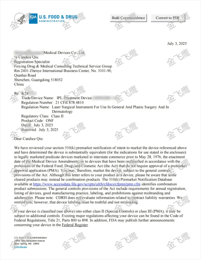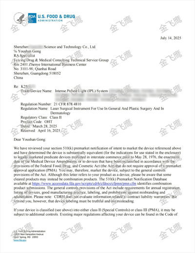 关注我们的朋友想必已经注意到,我们在脱毛仪510(k)注册领域的成就同样极为亮眼。由于成功案例实在太多,很多新取得的K号甚至都来不及一一宣传。值此机会,我们特别精选两张今年7月新出的K号与大家分享,更多脱毛仪510(k)成功案例,欢迎点击右侧链接查看☞IPL脱毛仪510(k)。