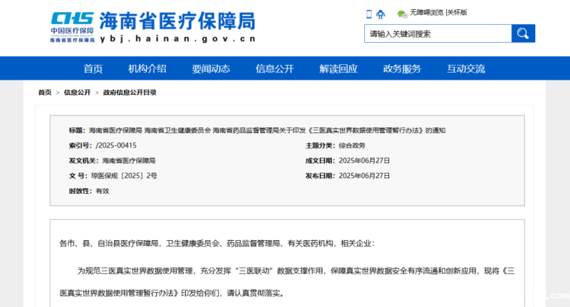 近日,海南省医疗保障局、海南省卫生健康委员会、海南省药品监督管理局联合印发《三医真实世界数据使用管理暂行办法》(以下简称《办法》),自2025年8月1日起正式施行,有效期5年。作为国内首个明确整合医疗、医保、医药(以下简称“三医”)三方真实世界数据资源并规范其应用的管理文件,《办法》的出台标志着海南在利用真实世界证据支持药械研发与评审、优化医保决策方面迈出关键一步。