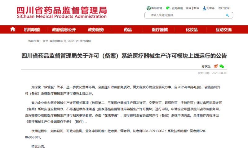 8月4日,四川省药监局发布《关于许可(备案)系统医疗器械生产许可模块上线运行的公告》(以下简称《公告》),其中提到,自2025年8月4日起,省药监局许可(备案)系统医疗器械生产许可模块上线运行。